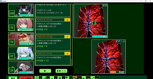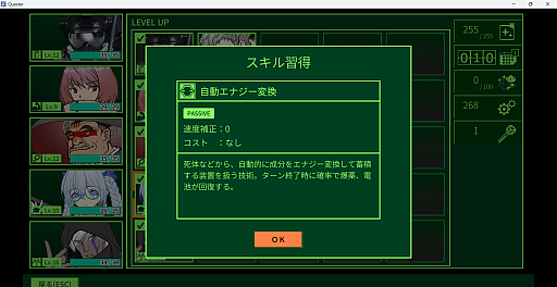 またコマンドによっては,バトルリソースである「薬品」や「電池」「爆薬」などを消費するものもある。戦闘開始時には最大値だが,戦いの最中に回復したいのであれば,専用のコマンドを使用する必要がある。