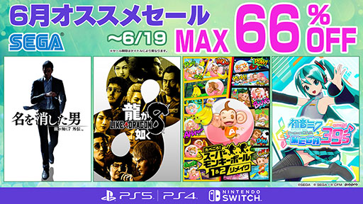 株式会社セガは、PlayStationStoreおよびニンテンドーeショップにて販売中の一部PlayStation 5/PlayStation 4/Nintendo Switch用タイトルを対象とし、期間限定で特別価格にて販売する「セガ 6月オススメセール」を開催中です。