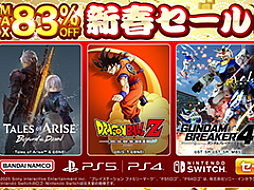 バンダイナムコエンターテインメントは,ダウンロード版ゲームソフトのセール「新春セール」を開催中だ。今回のセールでは,「Tales of ARISE」「ドラゴンボールZ KAKAROT」などがPS Storeで,「太鼓の達人 ドンダフルフェスティバル」「ことばのパズル もじぴったんアンコール」などがニンテンドーeショップで対象ソフトになっている。