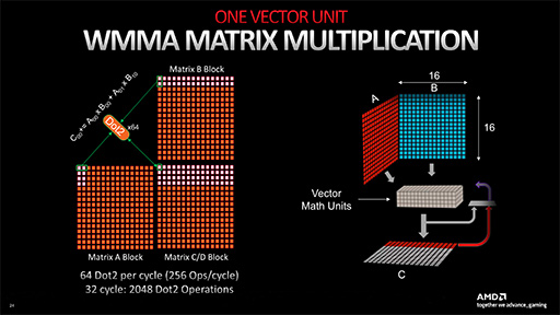 AMDは,RDNA 3アーキテクチャにおいて,GPUに推論アクセラレータ「AI Accelerator」を組み込んだ。これは,NVIDIAのGeForce RTXシリーズにおける「Tensor Core」に相当するものだ。すでにIntelも,単体GPUの「Intel Arc」シリーズに同種の「Xe Matrix Engine」(XMX)を搭載しているので,結果的にAMDは,GPUへの推論アクセラレータ搭載では最後発となってしまったわけだ(関連記事)。