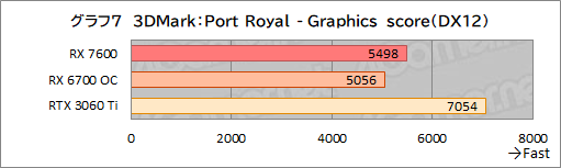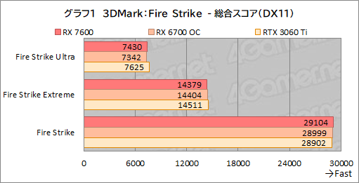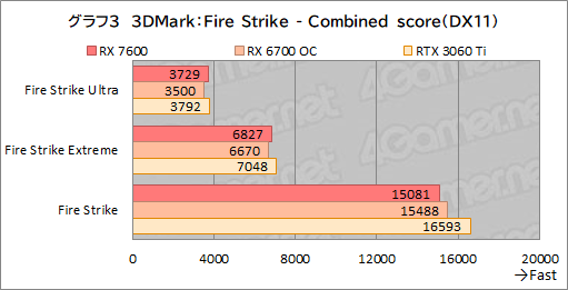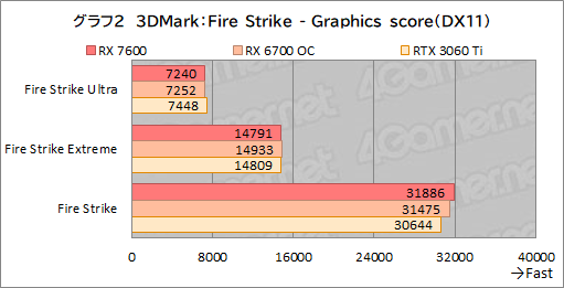 基本的に総合スコアを踏襲しており,RX 7600はRX 6700 COと肩を並べている。RTX 3060 Tiに対しても,Fire Strike“無印”であれば,4%ほど引き離している点は見どころといえよう。