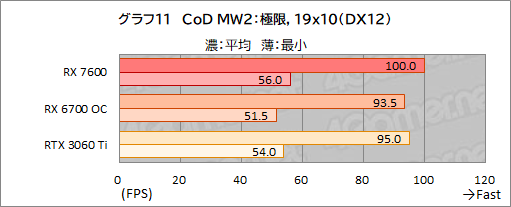 RX 7600はRX 6700 OCを約56%も引き離しているものの,それでもRTX 3060 Tiとの差は約41%ほどあり,差を詰められていない。