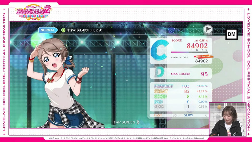 配信では実機プレイも行われ,斉藤さんが「未来の僕らは知ってるよ」(Aqours)に挑戦。演者の所感としては,前作と音やプレイ感覚も変わらず,“シャンシャンの感じ”もこれまでと同様だという。