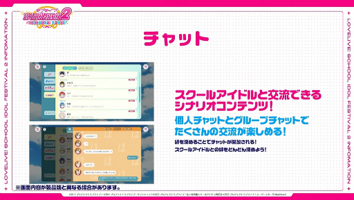 またシナリオコンテンツ「チャット」が導入され,こちらではスクールアイドルたちの絆をためることで(スクスタ的な?),少女たちと個人チャットやグループチャットでの交流を楽しめるという。
