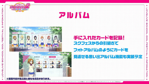 手に入れたカードを記録できる「アルバム」については,前作スクフェスからの引き継ぎ要素があり,カード記録を“フォトアルバムのようにして”継承できるという。また「プレイ実績に応じた特典」も適用されるようだが,注意事項としてはスクフェスのサービス終了日(3月31日)までにデータ提供の同意を済ませておく必要がある。