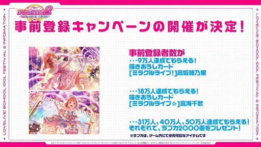 今後は各ストアでの事前登録者数に応じて,9万人突破でμ’s 高坂穂乃果,18万人突破でAqours 高海千歌のカードが配布決定となり,以降も登録者数50万人までのストレッチゴールが用意される。