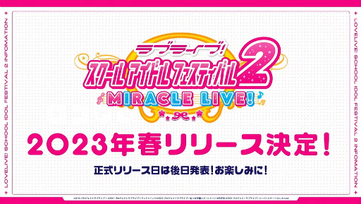 ブシロードは本日,イベント「スクフェスシリーズ感謝祭2022」の閉会式&新情報発表会を開催し,「ラブライブ!スクールアイドルフェスティバル2 MIRACLE LIVE!」の制作を発表した。詳細については明かされていないが,ティザーサイトがオープンし,キービジュアルとトレイラーが公開されている。