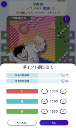 さらに,勝利時には「熟練度」も手に入り,これを使って「力」「速」「技」というパラメータを強化すると,選手が所持しているカードの数値を上げられる。プレイヤーの中には,各ライバルが対戦で出してくるポイントのパターンを記録して,どのパターンでも上回れるようにカードの数値を調整する人もいる。