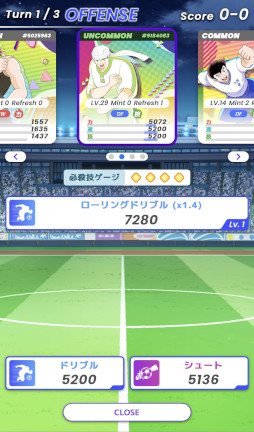 詳細なルールは,ホワイトペーパー※(外部リンク)を参照してほしいが,PvPモードも3ターンのカードバトルで,本質的なゲーム性はライバルモードと違いがないように思えた。カードの名称が「ドリブル」「シュート」などと変わっていたり,スタジアムや選手の相性による補正があったり,ゲージを使用する必殺技があったりするものの,プレイヤーのできることは基本的に最も数字の大きいカードを選ぶだけという印象だ。