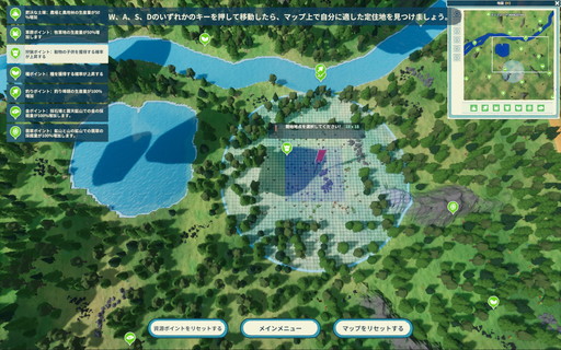 プレイを開始したら,まずはマップ内でどこに街を作るかを決める。魚を捕りやすい川の近くにするのか,それとも資源の多い鉱山の近くにするか,選択肢はさまざまだ。深く気にしなくていいが,やり込むつもりならどんな街にするかを考えてから場所を選ぶといいだろう。