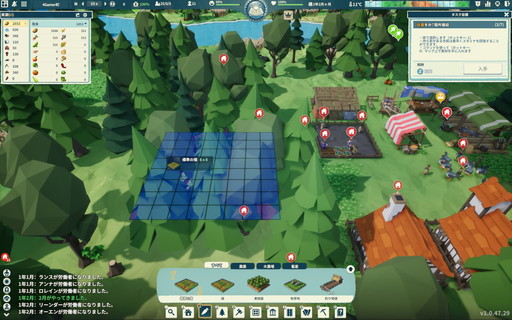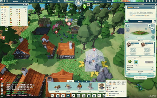 拠点を決めたら,そこに住む人たちが快適に過ごせる街づくりを始めよう。街の住民には家や食料が必要なので,木材や石材といった資源を集めて家や畑を作り,井戸を設置して最低限の生活ができるようにする。