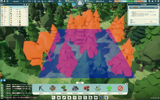 この操作は施設を作る時だけでなく,資源を集める時にも活用できる。食糧不足でピンチになっても,周辺の植物を一気に選択して集めることで,リカバリーしやすくなっている。