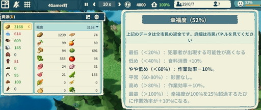 また,こういったジャンルでは定番だが,街には幸福度のパラメーターが存在する。病院がなくて怪我を治せない,住む家がない,食料が不足しているなど,さまざまな不満には早めに対処していかないと,住民たちの幸福度が下がってしまう。そうなると労働力が低下したり,場合によっては犯罪者が出てくる可能性もある。資源管理と街づくりだけでなく,住民が不満を抱いていないかをチェックするのもプレイヤーの役目だ。