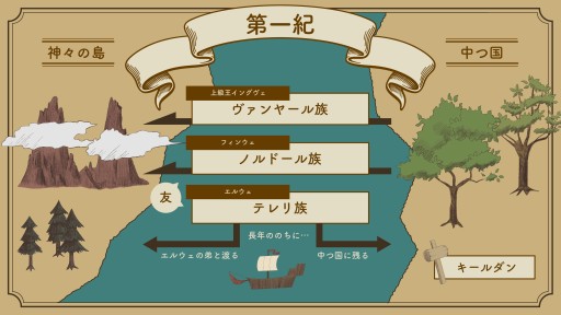 さて,目覚めたあとの人間にとっては長い年月を経て,エルフの友と呼ばれるようになる人間の三部族が青の山脈を越えた西側の地に到達しました。このとき彼らを見出し,最初に親しく交わったのはフィンウェの孫フィンロド。「指輪物語」の主要人物であり,ドラマ「力の指輪」の主人公でもあるガラドリエルの兄がフィンロドです。