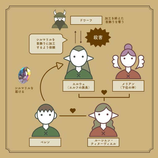 そして彼らの一人娘こそが,「指輪物語」でしばしば言及されるルーシエン・ティヌーヴィエルなのです。後にこのルーシエンと恋に落ちた人間ベレンは,娘を手放したくないエルウェ(このころにはエル・シンゴルと呼ばれています)によって科された試練を経て,モルゴスの手元にあったシルマリルの一つを奪取しエル・シンゴルの下へと届けて,ついに想い人と結ばれました。