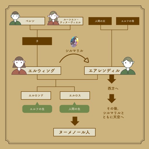 エアレンディルとエルウィングの子であるエルロンドとエルロスは,自らの意思でエルフの永遠の生と人間のはかなき運命のいずれかを選ぶ権利を神々より与えられ,エルロンドはエルフと世界の終わりまで運命をともにすることを,エルロスは人間として刹那の時を過ごすことに決めました。こうしてエルフと人間が合一した血筋は,我々の知る賢きエルロンドと,早くに没したエルロスの子孫であるヌーメノールの王族とに改めて分かたれたのです。