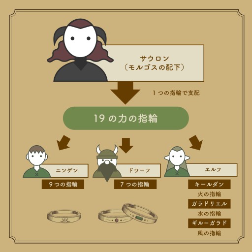 その間に,サウロンはすべての指輪を統べる「一つの指輪」を自ら作り出します。ですが計画は露見し,「三つの指輪」は彼から隠され,エルフの指導者たち,すなわちキールダンとガラドリエル,ギル=ガラドに託されました。