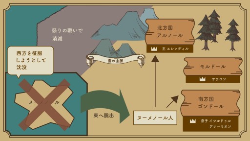 南方のゴンドールは,イシルドゥルの弟であるアナーリオンの血統が王を務めていましたが,その八十年ほど後には王が行方不明となり,以降は執政がゴンドールを統治することとなります。その間,元アルノールの治安は,王家の残党である野伏たちと,それを保護する裂け谷のエルロンドによって保たれました。