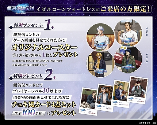 イゼルローンフォートレスにて、銀英伝ロンドのゲーム画面を見せることで、限定グッズが貰えるキャンペーンを開催します。本作のイラストを使用したグッズとなりますので、ご興味がある方はぜひイゼルローンフォートレスへ足をお運びください。