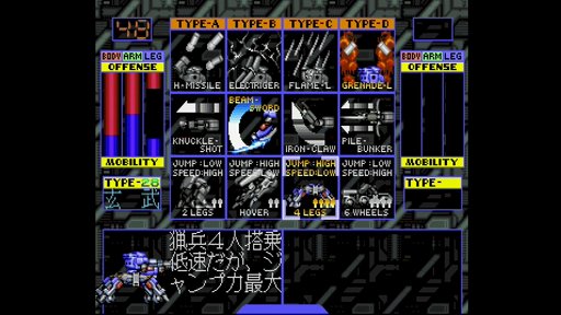 メカモノの発展を改めて振り返ると,重要なポイントの1つに「登場する機体のバラエティを増すこと」があるのではないだろうか。思えばメカを題材にしたゲームは,1980年代からカスタマイズ要素を追及してきた。合体メカの左右の手にどの武器を装備させられるかを選べる「ファイナライザー」(1985)。「胴」「腕」「脚」のパーツを自由に組み替えてオリジナルのメカを作れる「ウルフファング」(1991)。メカの「アーム」「レッグ」「サブウェポン」を敵から奪って自機を組み替える「パワード ギア」(1994)。「胴体」「右腕」「左腕」「脚部」を組み替えて様々な機体を構築する「フロントミッション」(1995)。ソフトに付属するフィギュアの「上半身」「下半身」「右手」「左手」を組み替えると,ゲーム内でオリジナル機体が誕生する「ゼクシード」(1996)……などなど,AC誕生以前の時代に限っても,組み替えやカスタマイズの遊びを取り入れたタイトルは少なくない。