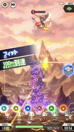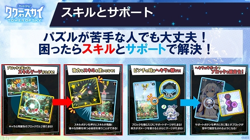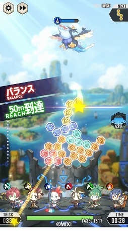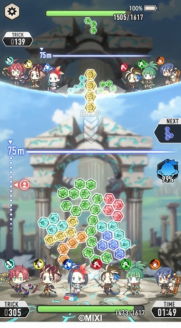 また,それぞれのキャラクターはスキルを持っており,ブロックを落とすことで増加するゲージがMAXになると,攻撃や回復といった大技を使える。キャラクターごとに使えるスキルが異なるうえ,ブロックの属性がキャラクターの属性と同じならゲージも溜まりやすくなるため,事前のパーティ編成も重要になりそうだ。