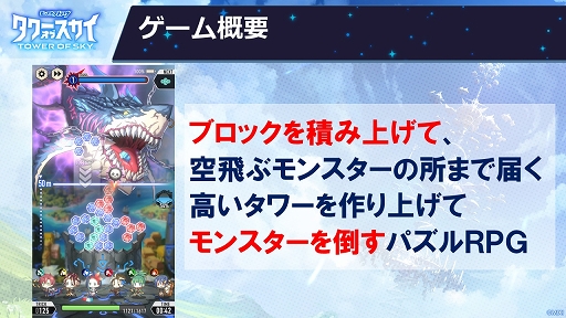 本作は2月28日に配信予定のスマホ向けパズルゲーム。舞台となるのは,立ち並ぶ塔に人々が暮らす世界で,空にはモンスターが飛び,人々を脅かしている。プレイヤーは