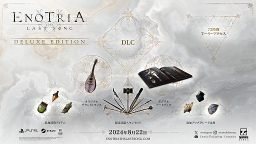 本日より全国のゲームソフト販売店で『Enotria: The Last Song』の予約受付を開始しました。ゲーム本編のほか、さまざまなダウンロードコンテンツがセットになって、通常より最大72時間早くゲームがプレイできる限定版「デラックスエディション」も発売いたします。また、パッケージ版・ダウンロード版ともに初回同梱特典として「オリジナルサウンドトラック」とDLC「武器アップグレード素材」が含まれます。ぜひお早めにご予約をお願いいたします。