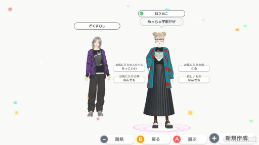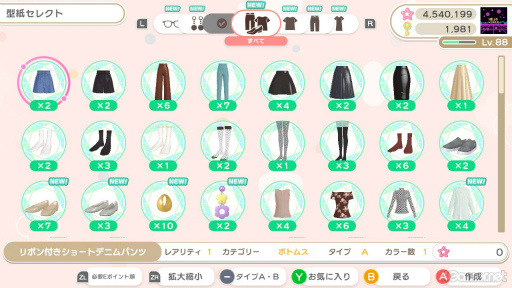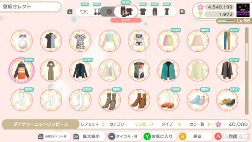 約1500種類(掲載時点)実装されている型紙を使って,オリジナルアイテムをクリエイトすることも可能だ。型紙は,プレイを進めてインフルエンサーとして成長する,アイテムをたくさん作る,ミューズと仲良くなるなど,さまざまなタイミングで手に入る。