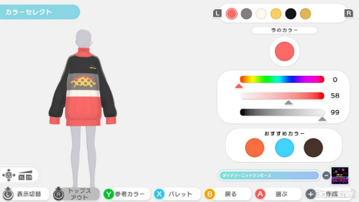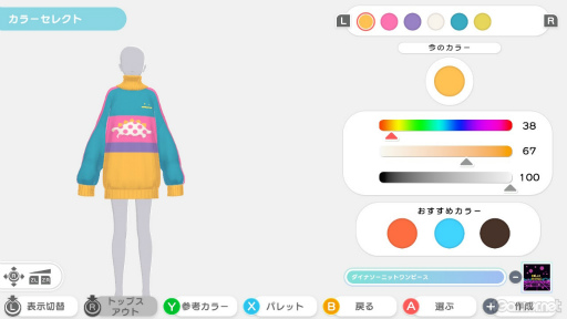 色相/明度/彩度のスライダーを使い,アイテムの色をかなり細かく設定できる点も,本作のこだわりだ。それに,相性の良い色を組み合わせた「パレット」も非常に便利で,なんと1000種類以上ものバリエーションがある。色合わせのインスピレーションを得たり,お揃いの色でアイテムを揃えたりするときに使ってみよう。