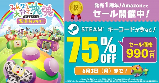 株式会社バンダイナムコエンターテインメントがAmazonにてSteamキーコードセールを開催したことをお知らせいたします。今回は、6月1日で発売1周年を迎える『みんな大好き塊魂アンコール+ 王様プチメモリー』が75%OFFとなっております。