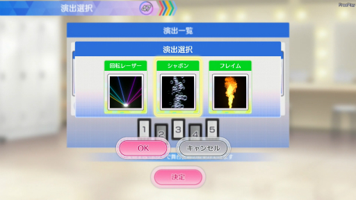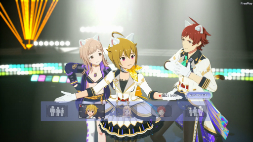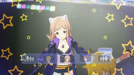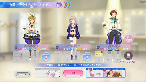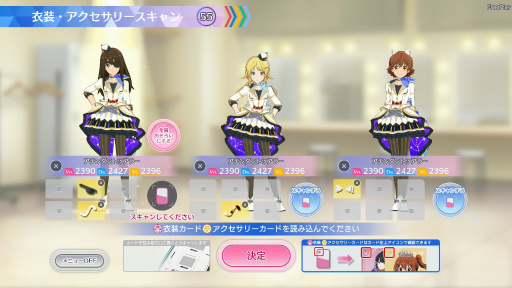 アクセサリー,衣装は1枚のカードで全員に同じものを一括で装着させられるほか,センターにはお姫さまティアラ,ライトにはねこみみ(白),レフトには悪魔の角……といったような感じで,3人別々のアクセサリーやコスチュームを身につけることも可能だ。