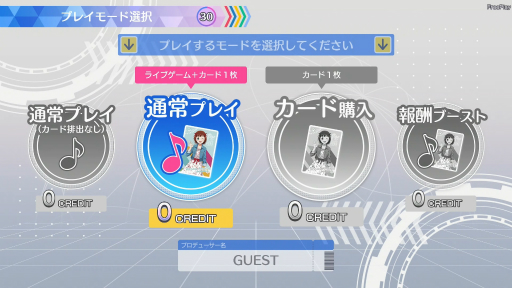 クレジット投入時に選べる,「ツアマス」のプレイ方式。製品版ではカードを排出なしでライブのみをプレイしたり,カードだけを買ったりできるようだ