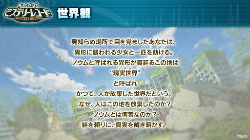 舞台となるのは,かつて人が放棄したという廃墟「現実世界(リアル)」。リアルで目覚めた記憶喪失の主人公(CV:小林裕介)は,心優しいルリ(CV:小松未可子),ノリのいいコハク(CV:江口拓也),明るく活発なアカネ(CV:ファイルーズあい),秩序を重んじるシヨウ(CV:梅原裕一郎),ミステリアスなカナリア(CV:古賀 葵)といった個性豊かな仲間達と共に,この世界に隠された真実を探っていく。