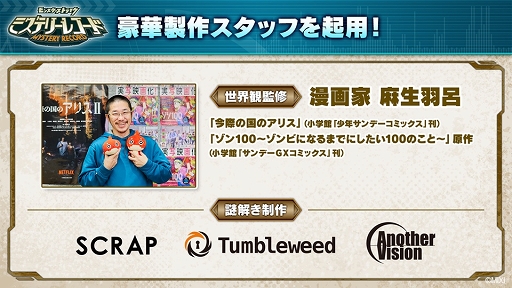世界観監修として「今際の国のアリス」「ゾン100〜ゾンビになるまでにしたい100のこと〜」で知られる漫画家の麻生羽呂氏を起用。ゲーム内で出題される謎は,SCRAP,Tumbleweed,東京大学AnotherVisionが制作している。