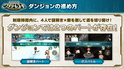 ゲームのメインコンテンツとなる「ダンジョン」は最大4人でのマルチプレイ専用で,「謎解きパート」と「ボスバトルパート」で構成されている。