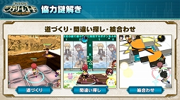 謎解きパートではマップ上にさまざまな謎が出現するので,4人で協力しながらこれを解いていく。謎解きは「間違い探し」や「絵合わせ」といった,誰もが一度は体験したことがある遊びがモチーフになっており,奥原氏によれば,サービス開始時点では約600問の謎解きが用意されているとのこと。ランキングも存在しており,ほかのプレイヤーと謎解きの成績を競い合うこともできるという。