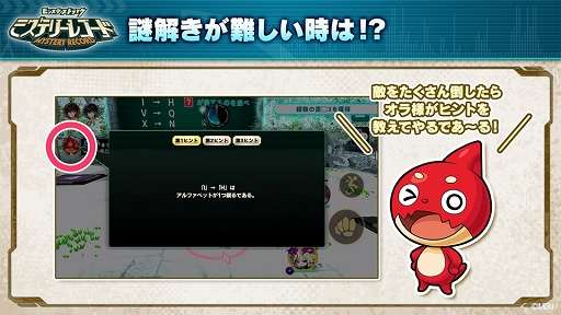 ほかにも,どうしても謎解きの答えが分からないときは,たくさんのノウムを倒すことで「モンスターストライク」でおなじみのオラゴンがヒントを教えてくれるという要素もある。
