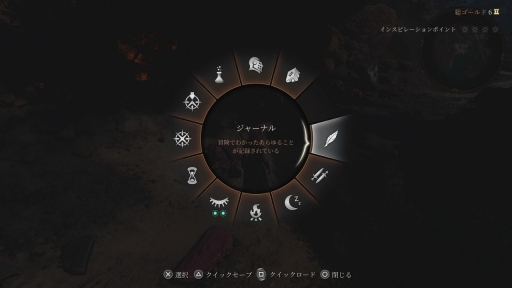 | セーブやロードなどのコマンドもサークル状に表示される。下記のインタビューにもあるとおり,最初からコントローラ操作を意識したUI設計になっているとのこと |