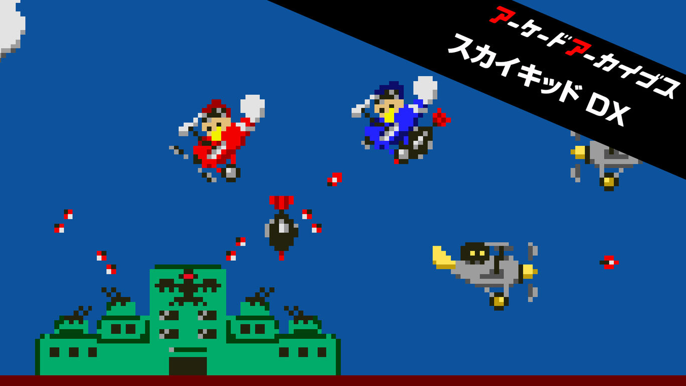 「スカイキッドDX」は1986年にナムコ(現:バンダイナムコエンターテインメント)から発売されたシューティングゲームです。 バロンとマックスを操作し、機銃や爆弾で敵を攻撃したり、宙返りで敵の攻撃をかわしたりしながら進んで、基地に着陸するとクリア。 巨大な要塞や戦艦は、爆弾で上空から爆撃して倒しましょう!2人同時プレイも可能。 また前作スカイキッドにはない、新ステージや新キャラクターが登場します。