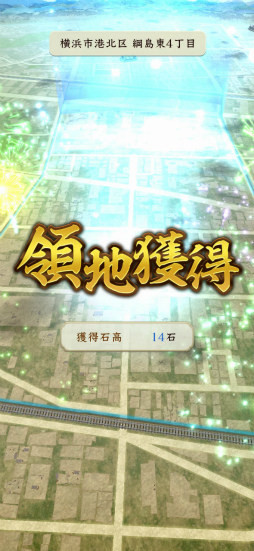 仮に横浜駅だとすると,拠点がある区画内まで歩いて近づき,手持ちの武将で編制した部隊で合戦を行い,攻略できると領地になり,ゲームの進捗度を表す「石高」が上昇します。合戦時は画面操作も可能ですが,戦闘自体はオートで進められる簡易的なものです。