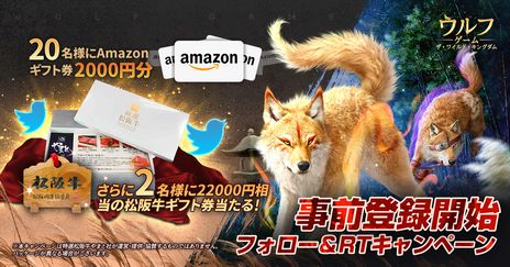 事前登録開始を記念して、公式Twitterアカウントで「事前登録開始フォロー&RTキャンペーン」を開始します。公式Twitterアカウントをフォローし、該当の投稿をRTしてくださった方の中から抽選でAmazonギフト券2000円分、A5等級限定の松阪牛券(22,000円相当)をプレゼント!