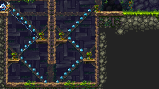 ソーのアクションそのものは手触りが良く,流れに乗っているときは爽快で操作していて楽しいが,ゲーム中は立ち止まって頭を使う場面も多い。多いというか,ステージは基本的に複数のパズルで構成されているため,本作のゲームプレイは「まず攻略方法を考えて,実際にソーを動かして答え合わせをする」という流れになる。以下,ほんの(そして簡単な)一例を紹介しよう。