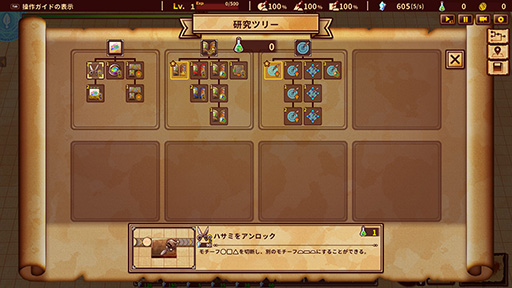 特に重要なのが「研究ツリー」を進めるための研究ポイントだ。このゲームには研究ポイントを使わないと開放できない施設があり,例えば研究ポイントを使用することで,図形を切り取って別の図形にするための「ハサミ」をアンロックできる。ハサミで切り取った図形は「弓兵」「槍兵」などの生産に必要となる。