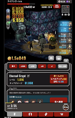 敵は1体ずつ出現し,だいたい5体倒すと時間制限のあるボス戦となります。これを1部屋として区切っていて,1フロアには49個の部屋があります。フロアは地下1階からスタートして無限に潜っていけるので,強いプレイヤーは地下何百階,何千階に到達することもあるでしょう。