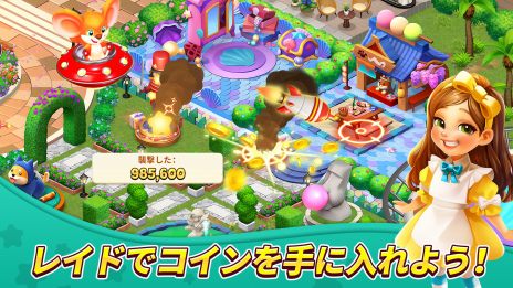スロットマシンを回してコインなどを手に入れましょう!また、シールドを使ったり、レイドを行ったり、チャレンジステージに挑んだりすることもできます!スロットで手に入れたお宝やコインを使って、リゾートマンションを改装し、新しいストーリーやキャラクターをアンロックしましょう!