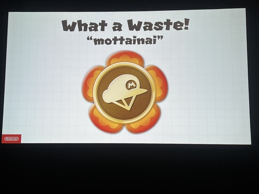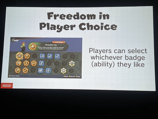 またもうひとつのMOTTAINAIとして,マリオたちの性能を自由に切り替えるバッジも紹介された。ジャンプで壁にくっついてさらにそこからもう一度真上にジャンプできる「カベ登りジャンプ」,いつもより高くふわっとジャンプできる「ふわっとジャンプ」などその種類はさまざまあるが,これは“とても時間をかけて作ったのに,一度クリアして遊ばれなくなったらもったいない”という考えもがあったことも導入の理由のひとつだったとか。