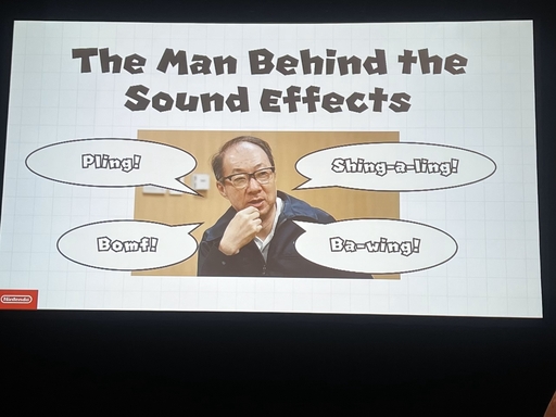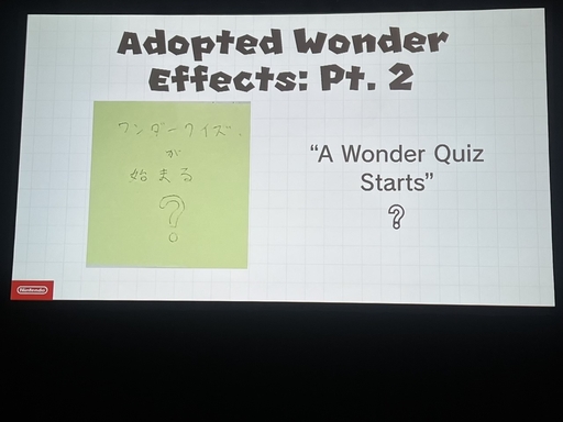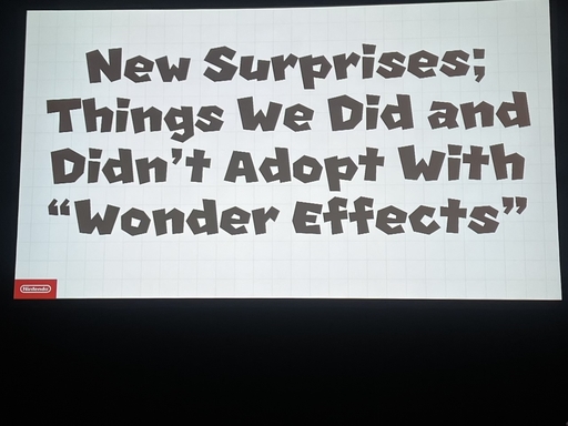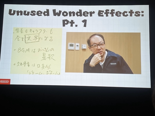 採用されなかったアイデアも紹介された。ひとつが「ワンダーが起きると背景もキャラも実写化し,マリオは八頭身に。BGMはおっさんの鼻歌で,効果音は口真似で『ぴよーん』」というもの。サウンドディレクターでマリオサウンドの生みの親でもある近藤浩治氏のアイデアである。