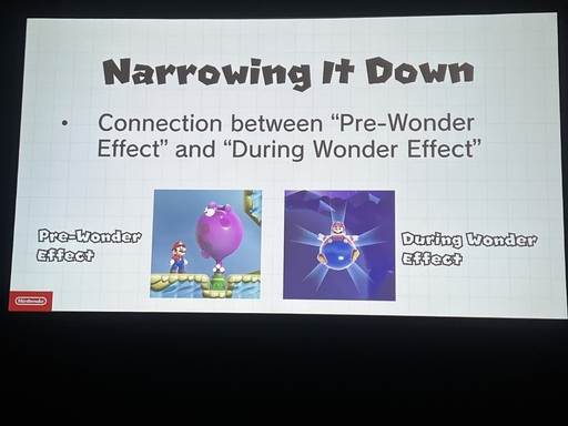 ワンダーは最初から構想にあったものではない。2Dマリオが抱える課題に向き合い,それを解決するために生まれたものであり,その答えは誰も知らない。それはチーム全体で見つけるものであり,誰も答えを知らないものを作るからこそ,制作していて楽しいと毛利氏は話す。
