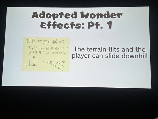 その例として,採用されたアイデアもいくつか披露された。ひとつめは,イラスト付きで書かれた「ステージ全体が傾き,ずっとしゃがみすべりでコースを進んでいく」というもの。このアイデアは,けっこう元のまま採用されていることに,本作をプレイした人なら気がつくだろう。