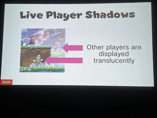 この課題の解決方法はいろいろあるが,マリオワンダーでは「ほかのプレイヤーが自分に直接干渉することなく,ミスをしたときに助けてくれて,自分自身も良い行動しか起こさないようにする」という道を選んだ。それが,半透明で表示されるライブゴーストとのオンラインプレイだ。